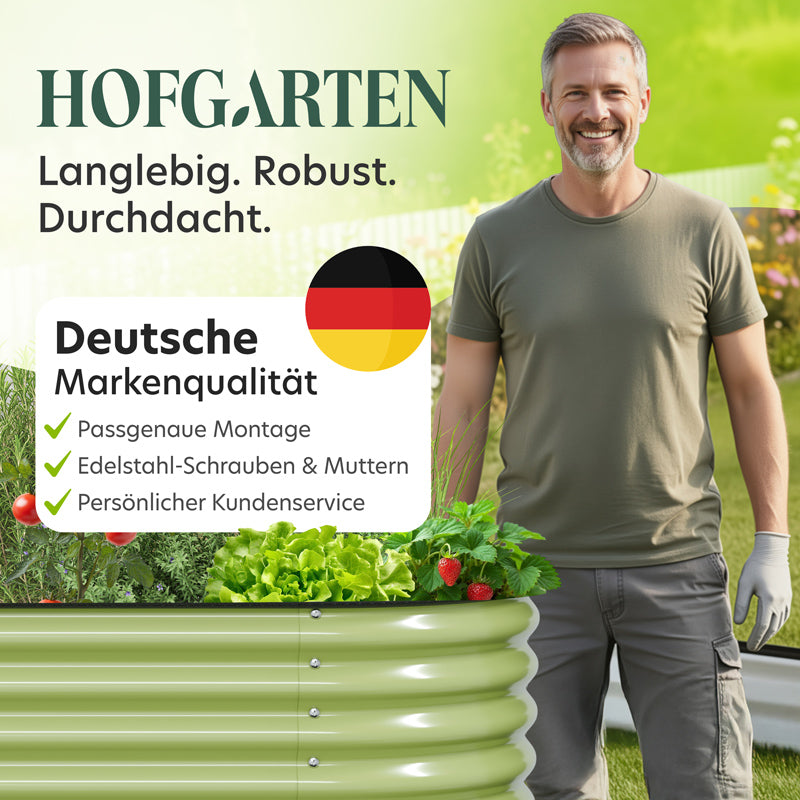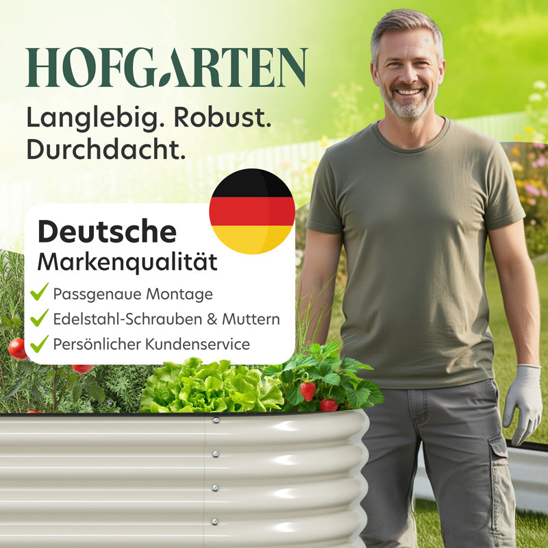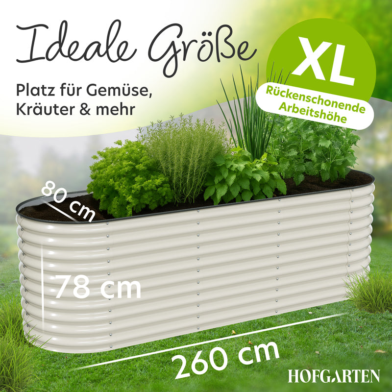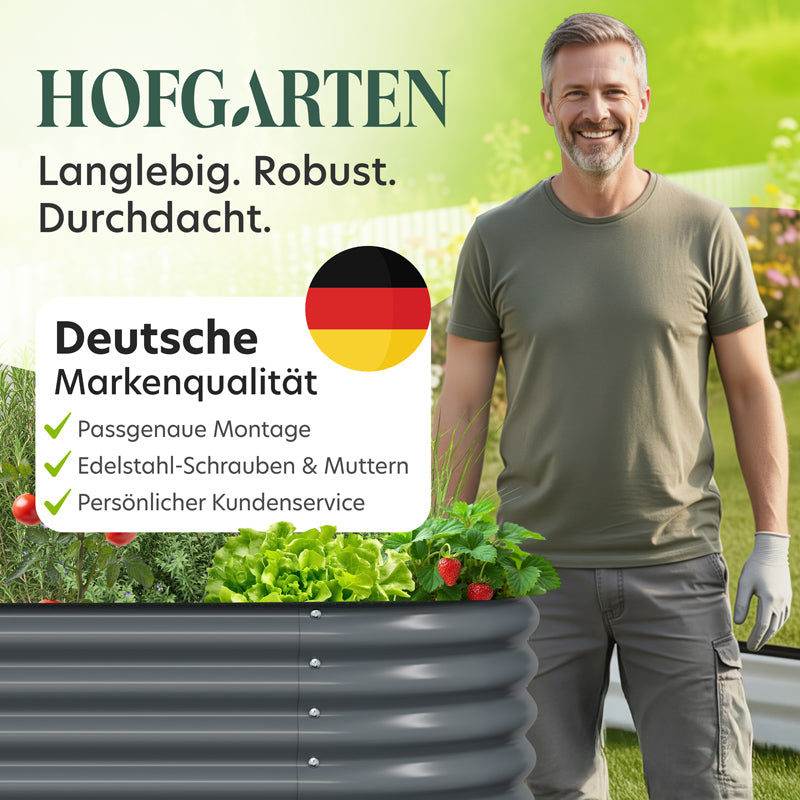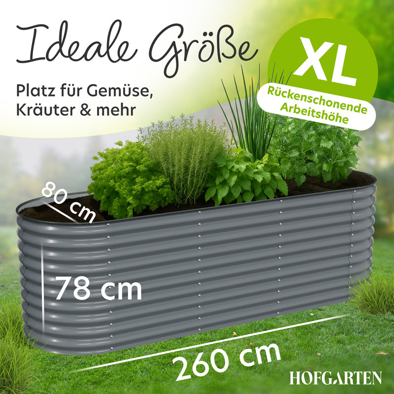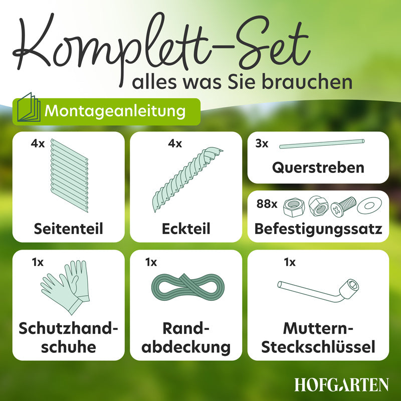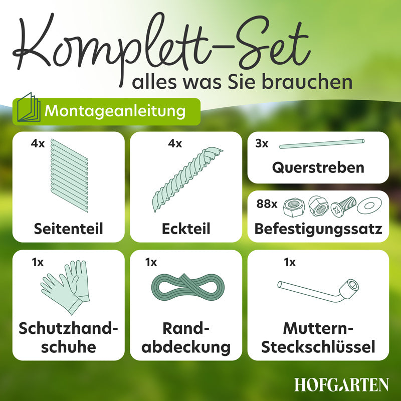 | Lieferumfang | Variante 200x80x78 cm: 8-teiliger Hochbeet-Bausatz (4 Eckteile, 4 Seitenteile), Edelstahl-Montagematerial, 3 Querstreben, Randabdeckung, 10 Pflanzschilder, Montageanleitung Variante 260x80x78 cm: 10-teiliger Hochbeet-Bausatz (4 Eckteile, 6 Seitenteile), Edelstahl-Montagematerial, 6 Querstreben, Randabdeckung, 10 Pflanzschilder, Montageanleitung |