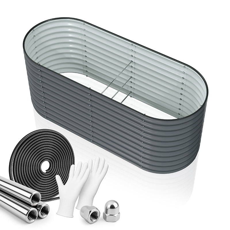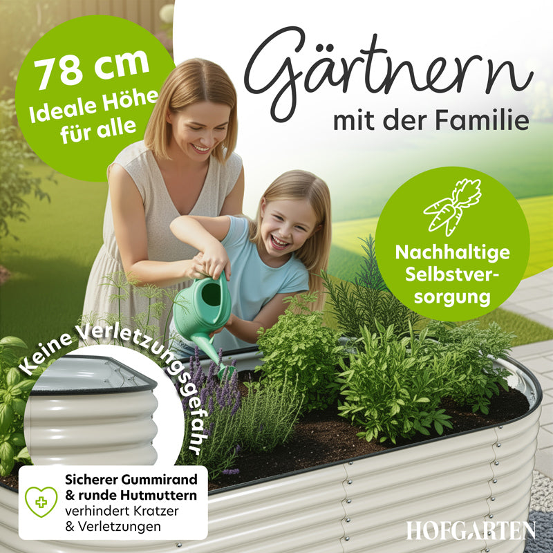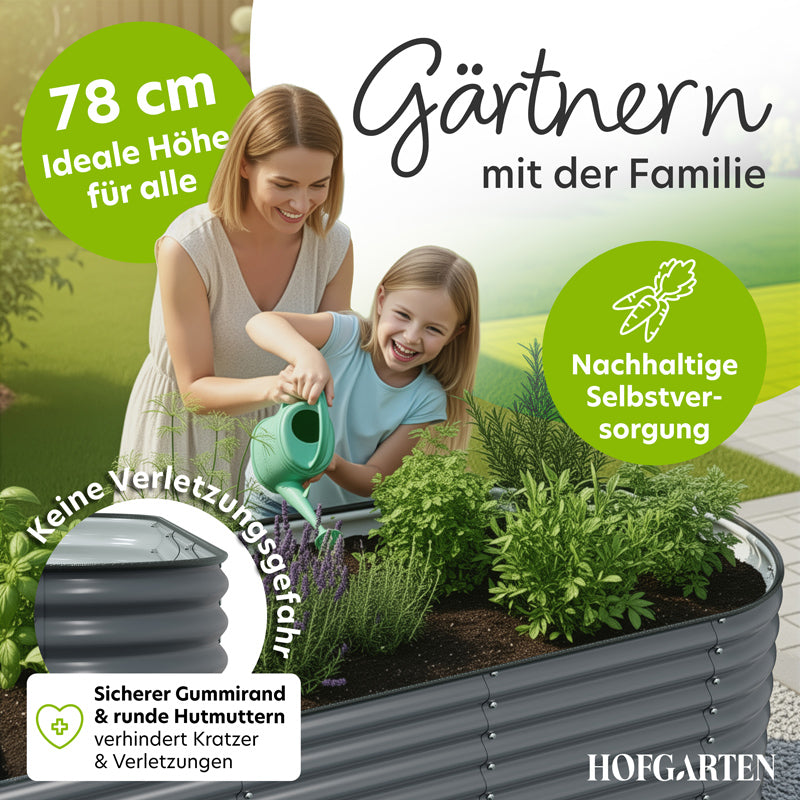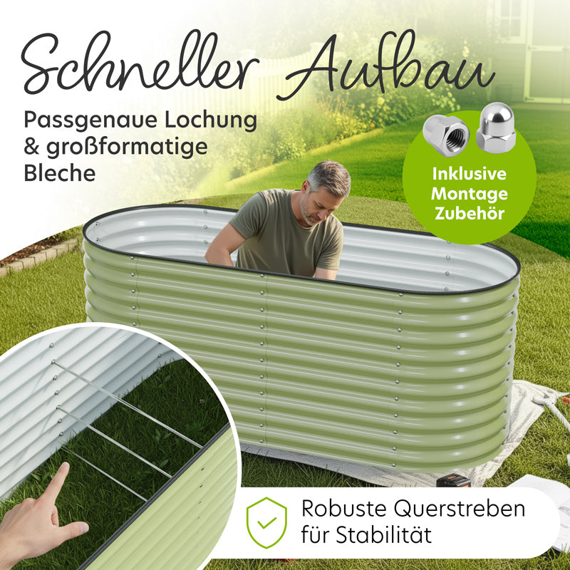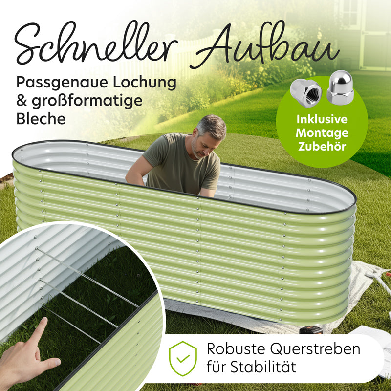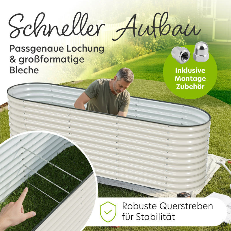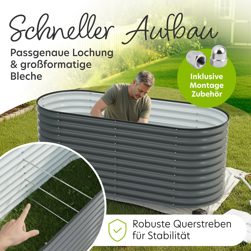 | Lieferumfang | Variante 200x80x78 cm: 8-teiliger Hochbeet-Bausatz (4 Eckteile, 4 Seitenteile), Edelstahl-Montagematerial, 3 Querstreben, Randabdeckung, 10 Pflanzschilder, Montageanleitung Variante 260x80x78 cm: 10-teiliger Hochbeet-Bausatz (4 Eckteile, 6 Seitenteile), Edelstahl-Montagematerial, 6 Querstreben, Randabdeckung, 10 Pflanzschilder, Montageanleitung |